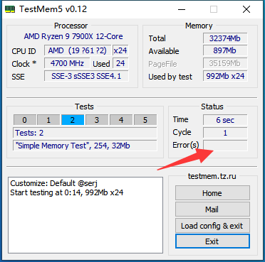等待程序自动运行(根据你的内存容量测试时间有长有短,大概10分钟左右),如果箭头所指处出现了数字,那么可以断定内存导致了故障。