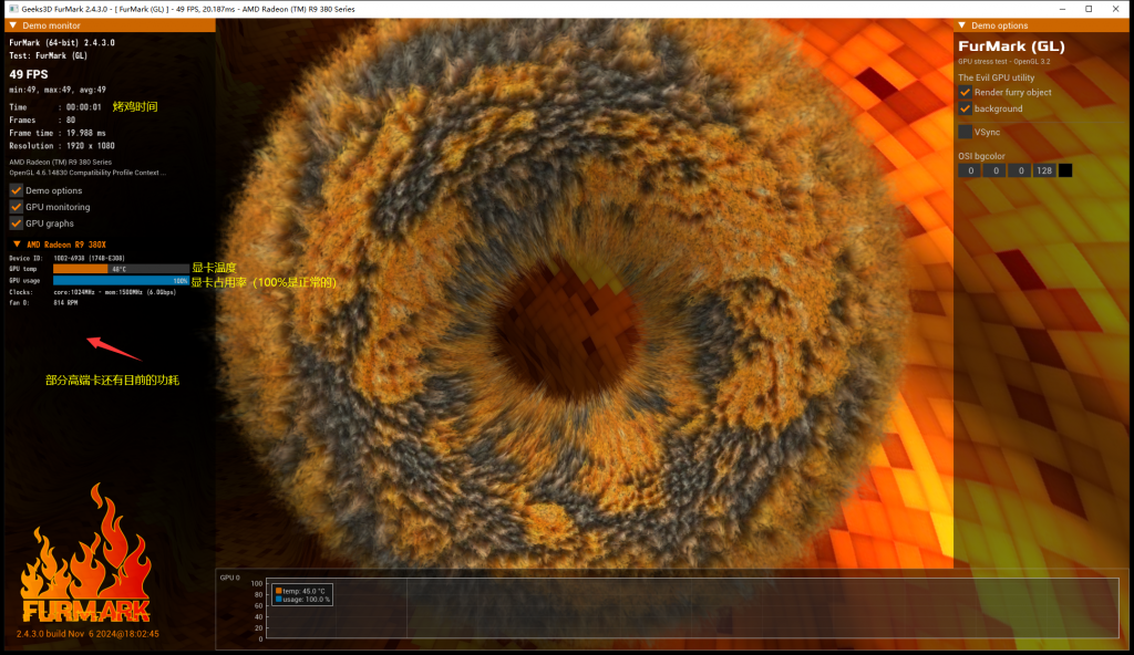 关注如图所示的你的几个显卡参数,然后烤机持续15分钟左右即可。该程序会模拟显卡高负载运作,以达到检测散热和显卡本身渲染能力。如果烤鸡期间出现了花屏卡死那么可以判定显卡硬件故障,如果出现关机或重启,那么可能是供电不足或温度或显卡温度过高导致的。