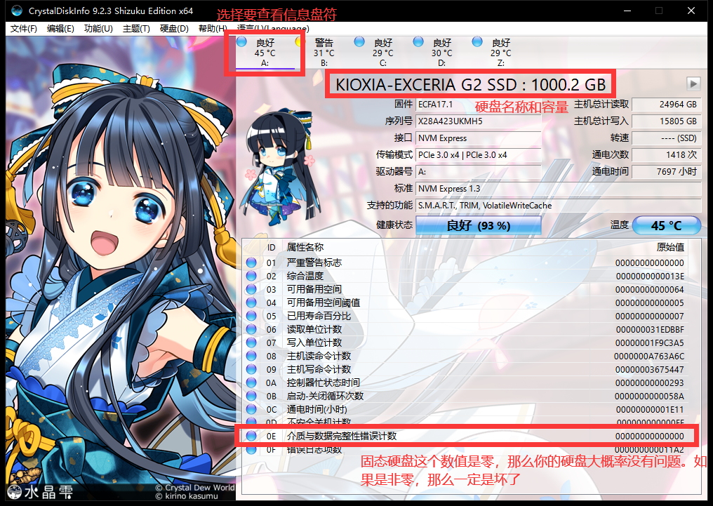 固态硬盘主要关注0E这项是否有数值,有数值代表一定有问题,没有数值不能说明完全没问题。