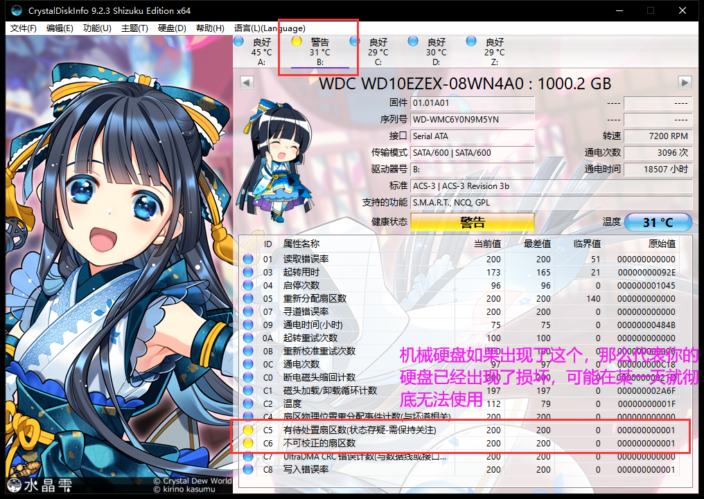 机械硬盘主要关注C5和C6这项是否有数值,有数值代表一定有问题,没有数值不能说明完全没问题。