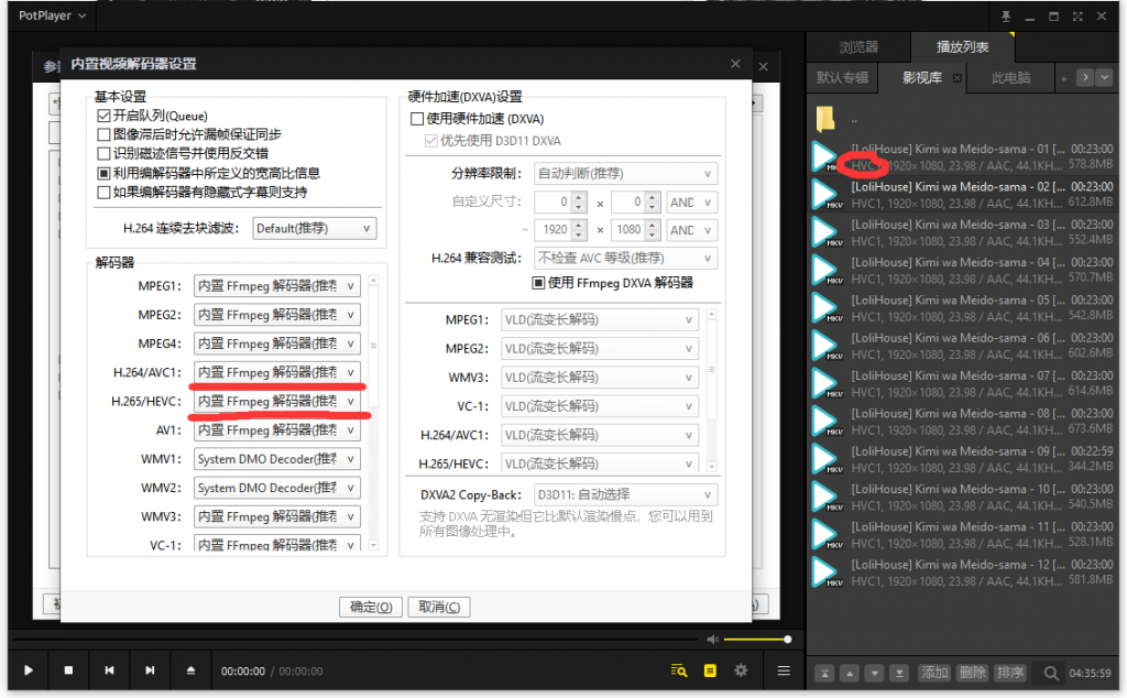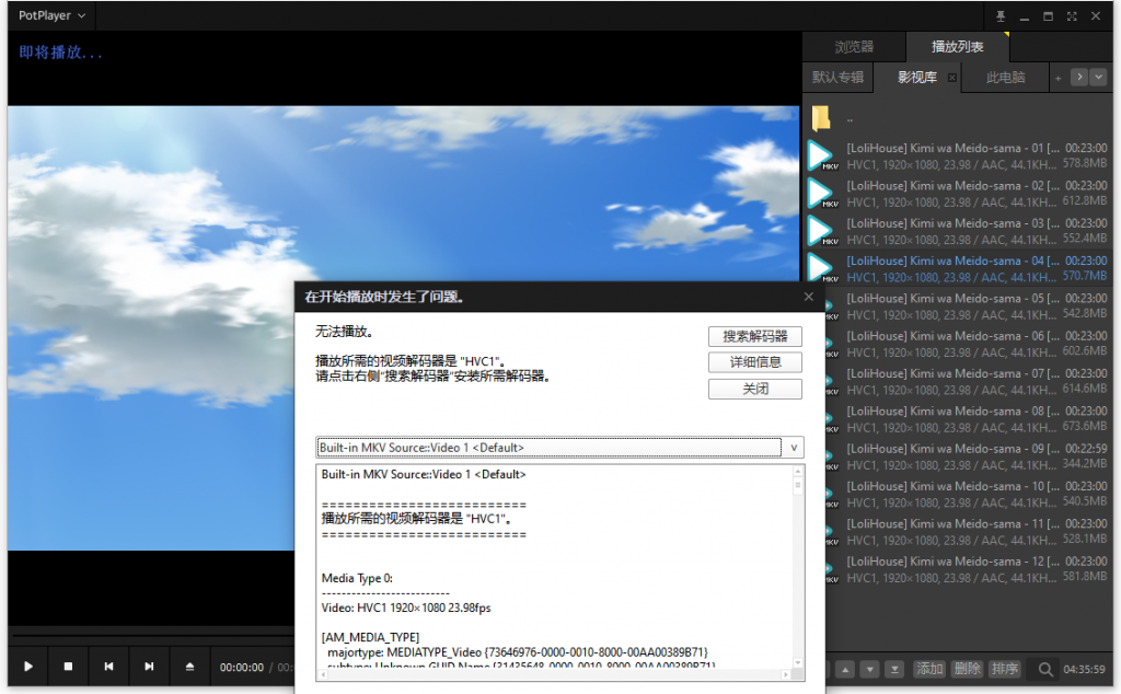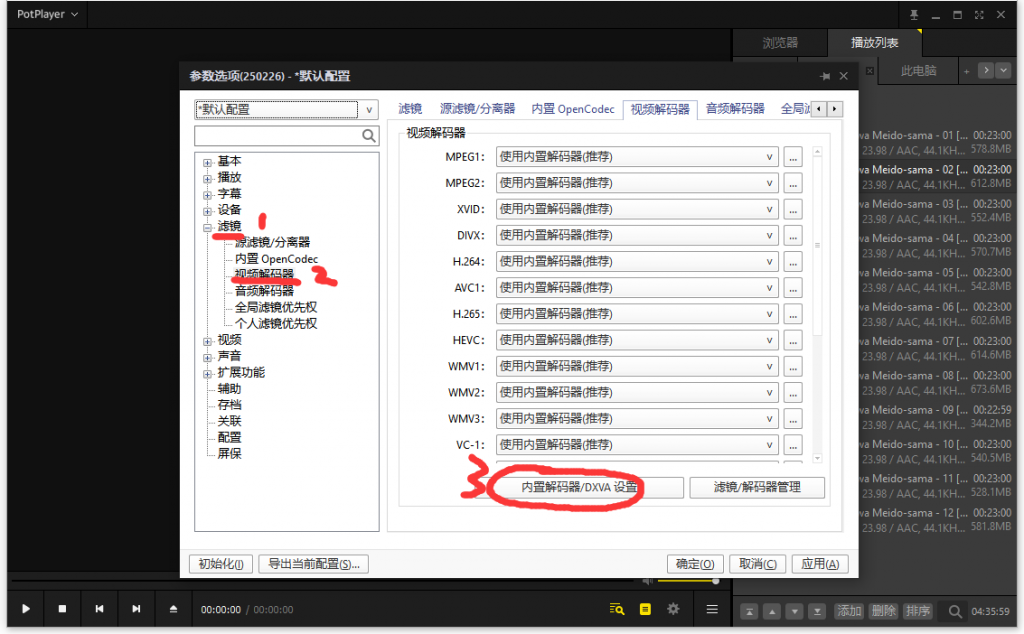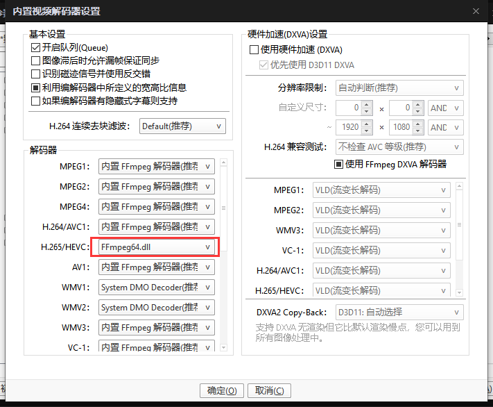 根据你具体是播放什么类型的视频导致卡死,可以在左侧这栏切换对应的解码器,尝试保存后重新播放(笔者是播放HVC1导致卡死),于是切换H.265/HEVC为FFmpeg64.dll(这是额外下载的解码器,在安装时有提示,找不到该选项的可以重新安装,在最后选择安装额外的编码器),或者下载Github开源的额外解码器支持(官方HEVC格式是收费的,在微软商店可以看到,7元)