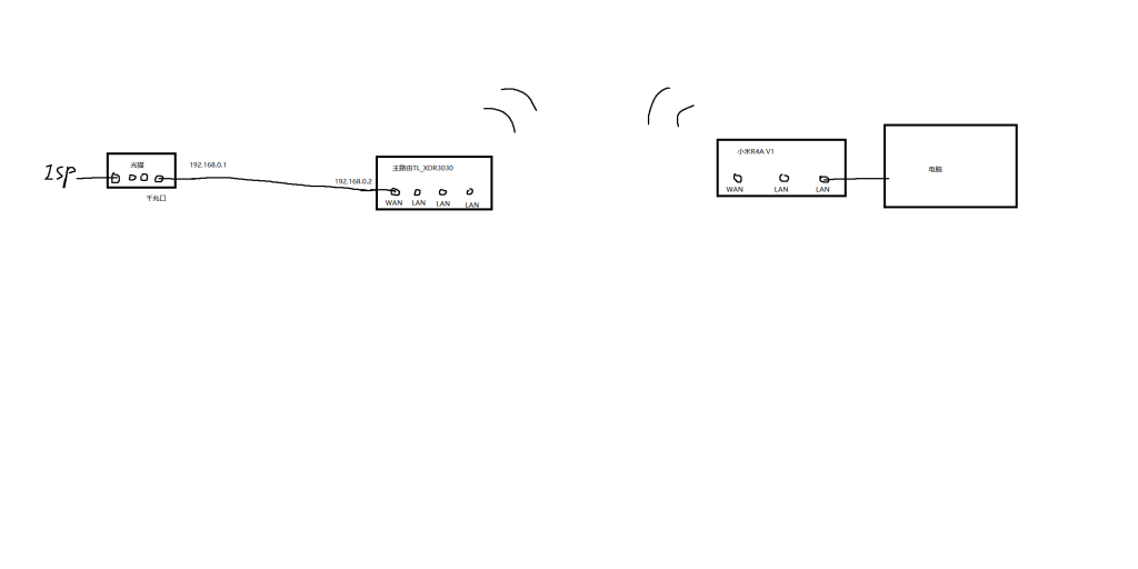 原本想实现这样的网络拓扑图,主路由还是原来的固件,小米这个当作无线中继并且刷上固件实现科学上网(连接主路由就正常,连接小米这个就可以科学上网等)。结果捯饬半天发现Padavan不支持无线中继模式下运行ssr。后来就直接有线中继了。一下子就好了。现在看来好像要是都熟悉的话十几分钟就能完成,害,自学习的过程有点难啊。